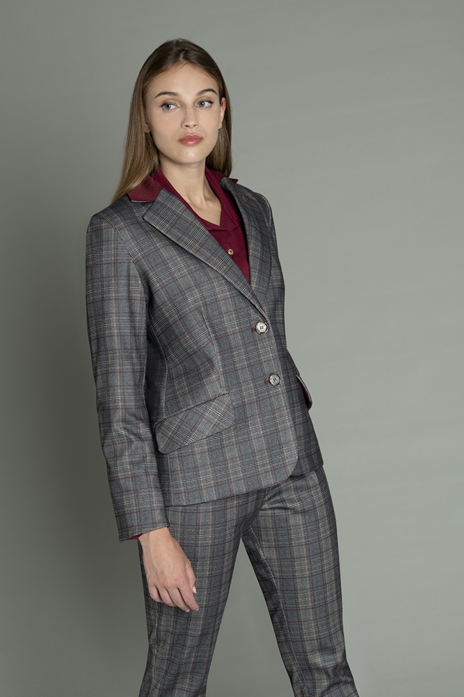 Chaqueta en tejido de príncipe de gales, de cuello y solapa y dos botones. El cuello esta contrastado en tejido liso.